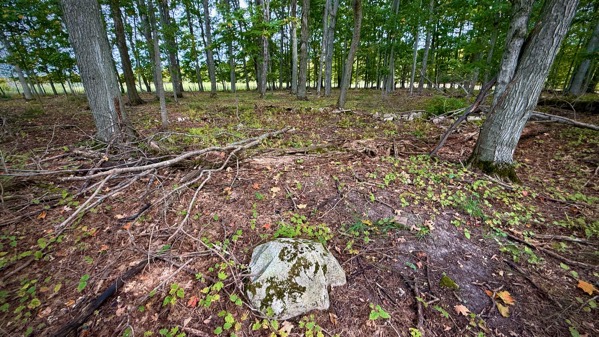 I find this very-large-rock-for-the-location, which is in The Grove on the highest part of the property, a splendid anomaly. My eye is always drawn to that thin stripe of grass below the lowest branches, a situation created by deer browsing, I assume through the winter hungries.