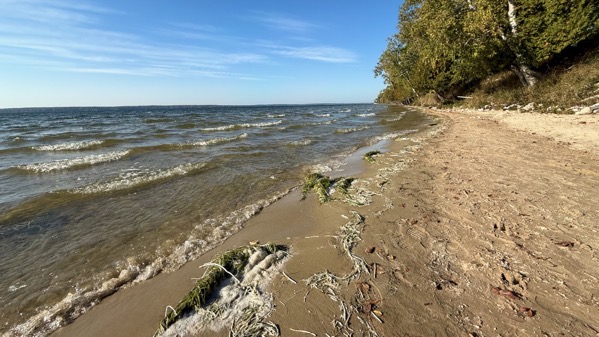 When I visited the beach this morning, it was after, I’m guessing, at least a day of windiness…that is, most of yesterday and overnight…hence the floral detritus the waves are depositing on the sand.
