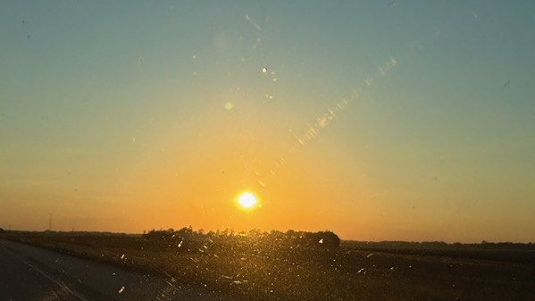 And here’s today’s sunset, complete with windshield flares. No Great Lake in Southern Indiana, even a bay of a smallish lake, although we did pass by Big Lake at some point.