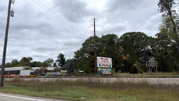 Our morning began west of Traverse City, and therefore off our typical I-75 axis. Pleasantly. So, we stayed west of I-75 all through Michigan, where farm stands selling pumpkins and big pots of mums were abundant. Look for mums on the far left between the arch-roofed structure and the RR tracks.