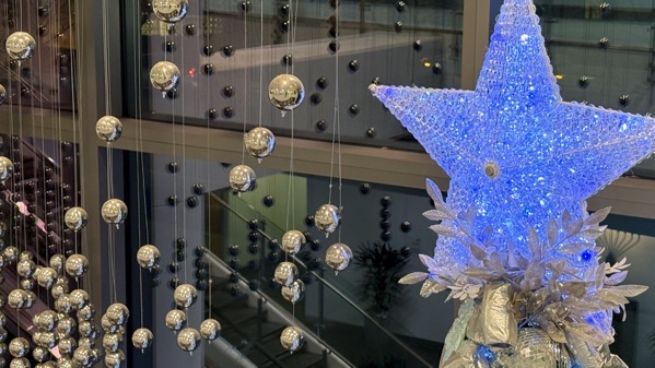 Our neighbor went for the easy, low-degree-of-difficulty, outdoor seasonal lighting. It’s a light with a slow-spinning color wheel in front of it pointed at the front of his house. Side benefit for us, the moving points of light come in our windows, too. [I would not be pleased at all if they came in the bedroom.]