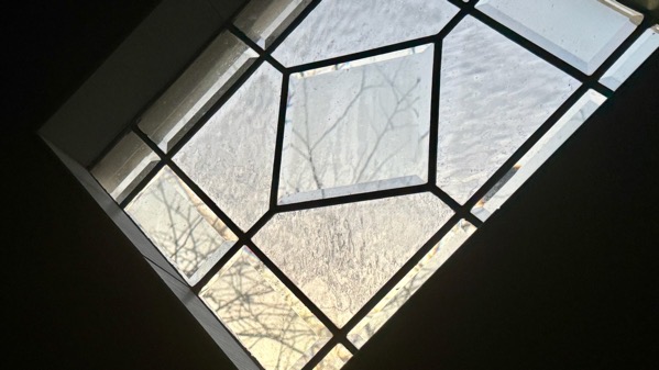 Shall we ponder the contrasts between the angles and the shapes they outline, and the organic shapes of the twigs through the glass?