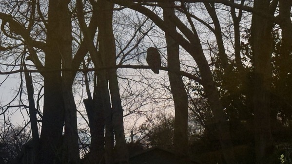 After the sun faded, I noticed an owl (pretty sure) hanging out near our back door. My theory is that it is perched lower than usual to avoid some of the wind.