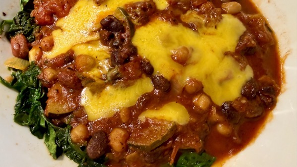 I’ve been trying to cook/eat lower on the food chain, as in more plant protein. My go-to these days includes a veggie bean stew, which has endless variants. When I heat leftovers, lately I’ve been microwaving some fresh spinach in the bowl first, then adding the stew and heating it all again. This bowl has bonus cheddar.
