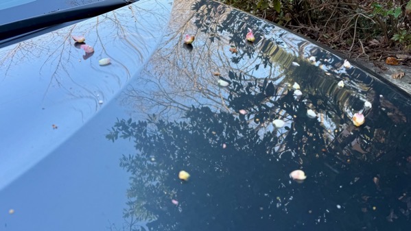 We went out to do an errand and discovered that a squirrel had been feeding on the camellia bud hearts above the car. Is that the floral equivalent of maple sap-syrup?