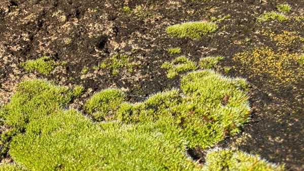 Moss-world is flourishing these days, including on this aging wall of decaying concrete.
