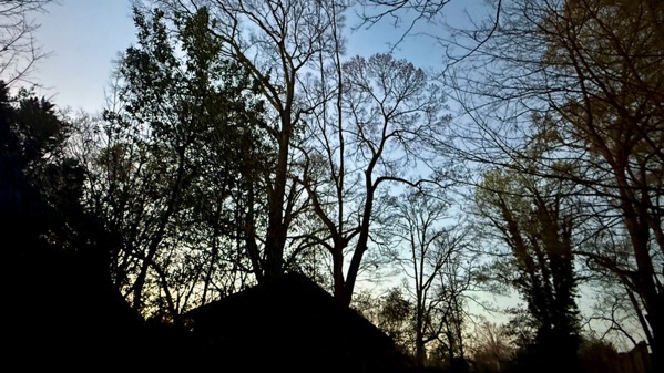 I thought this shot would show more orange glow by the horizon. You can also see the tree-leaves are beginning to emerge.