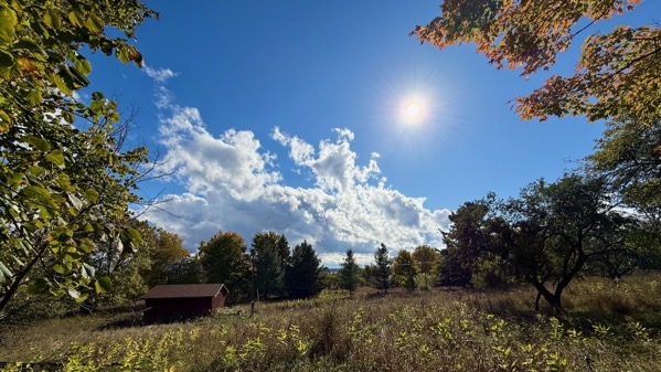 Here’s the afternoon sky, and you can see the leaves are slowly turning on the face of the woods. [It’s much quieter, it seems, with the neighbors gone.]