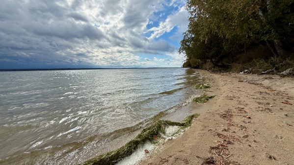 …down to the beach where I found windrows of chara and phragmites (water plants) thrown up by the wave action.