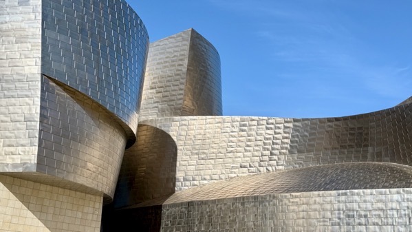 I include this picture of the Guggenheim museum from last winter, the one in Bilbao. This is day two of our visit, when we walked around outdoors on a gorgeous sunny day. Day one was rainy, and so we went in the museum and looked out rain-streaked windows and soaked in artsiness.
