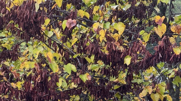 So, midmorning I swept the balcony free of leaves. At 3pm I looked out and found a new crop had recolonized it. I’m looking at you tulip poplars. [Not this taxus, or whatever it is.]