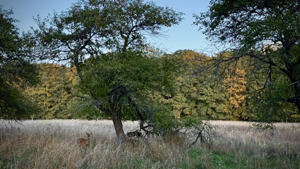 I went out for a late-day sun-on-the-trees shot, and the sun went away at the same time I spotted *three deer under the apple tree* (really: there are two you probably can’t spot), which Taylor Swift might want to turn into a song lyric. 🤣