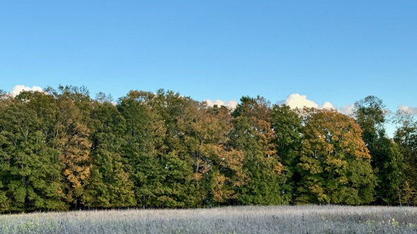 Here’s the afternoon sky, and you can see the leaves are slowly turning on the face of the woods. [It’s much quieter, it seems, with the neighbors gone.]